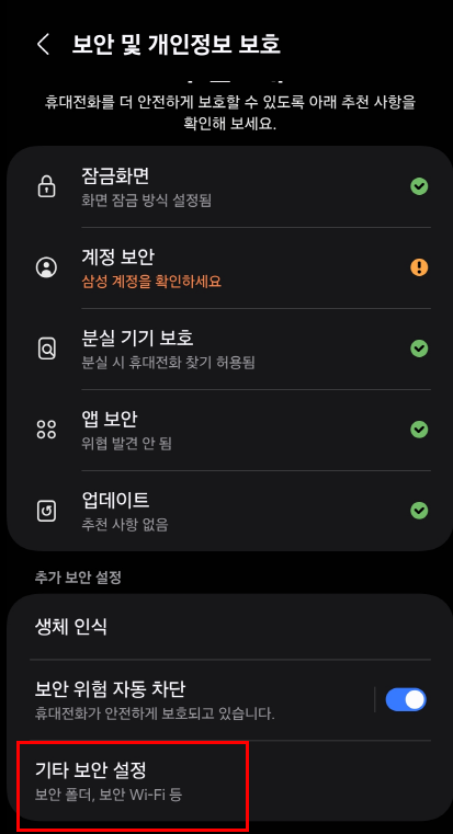 - 설정 > 생체 인식 및 보안 > 기타 보안 설정
